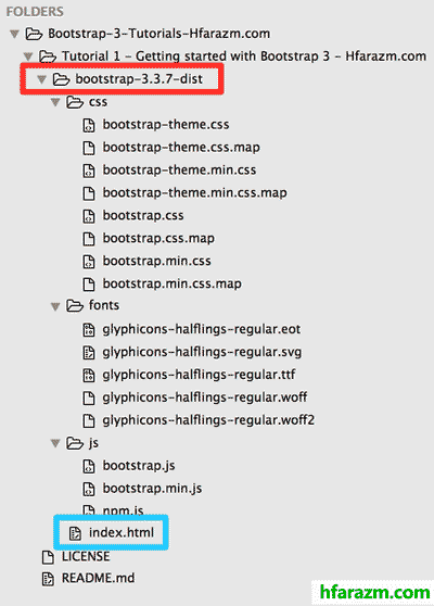 - About dist Folder: After downloading the Bootstrap file, extract it and open the folder. Goto “*- dist” (distribution) folder (highlighted in Fig 1.1). dist folder is the heart of Bootstrap and it is all you need to work with Bootstrap. If you open “dist” folder it contains three main folders i.e css, fonts, js and some files inside them. (see Fig 1.1)